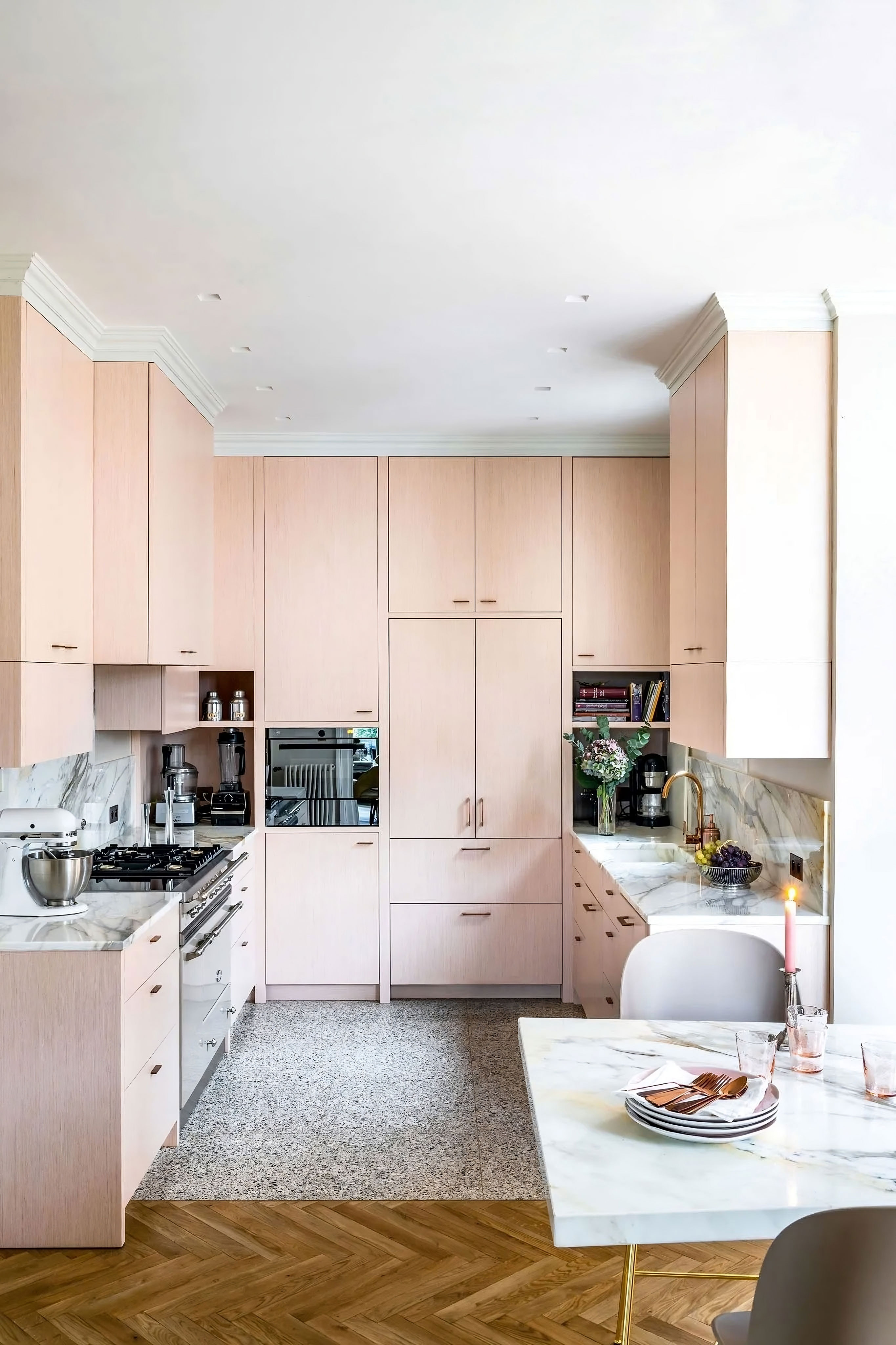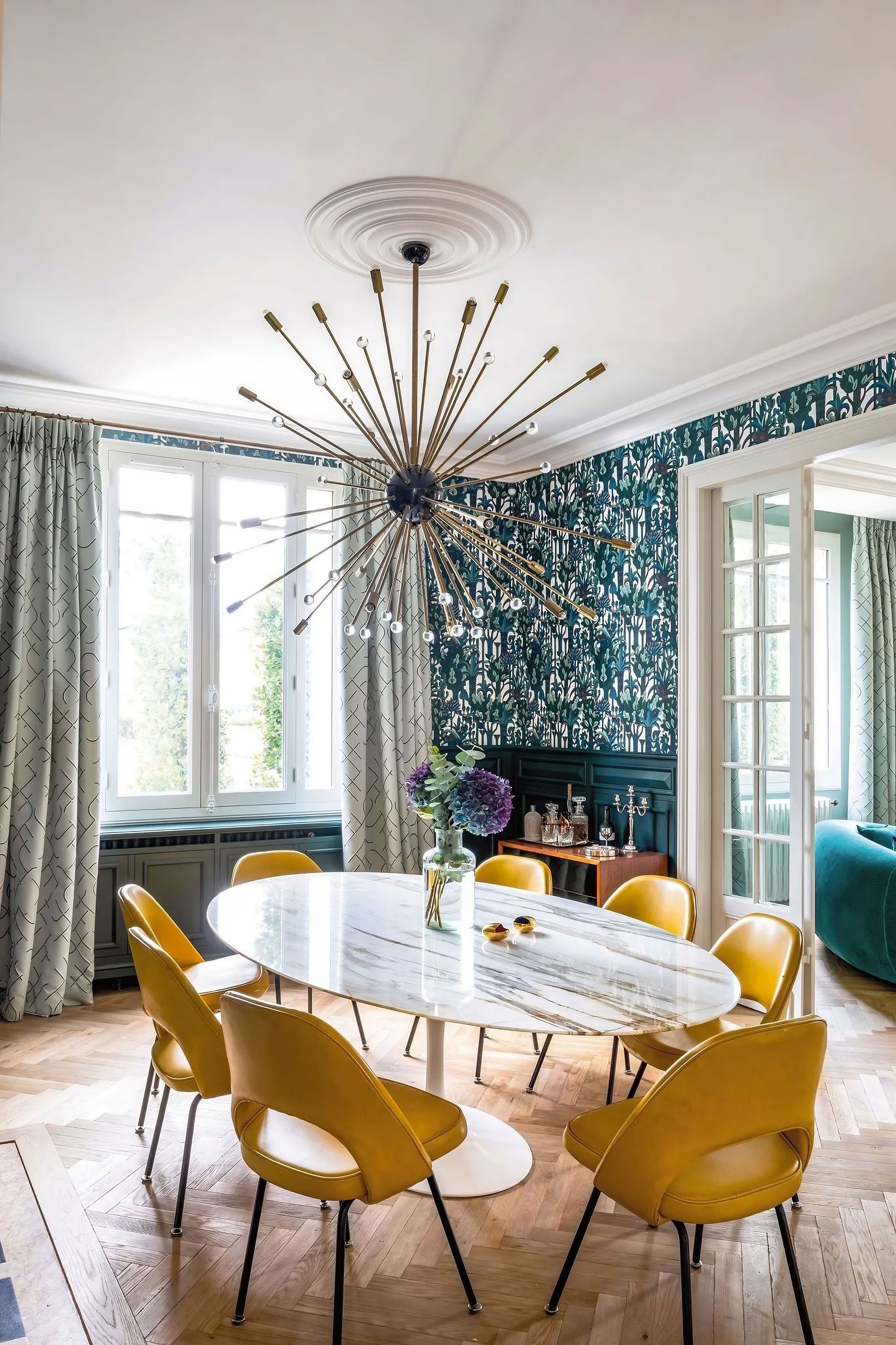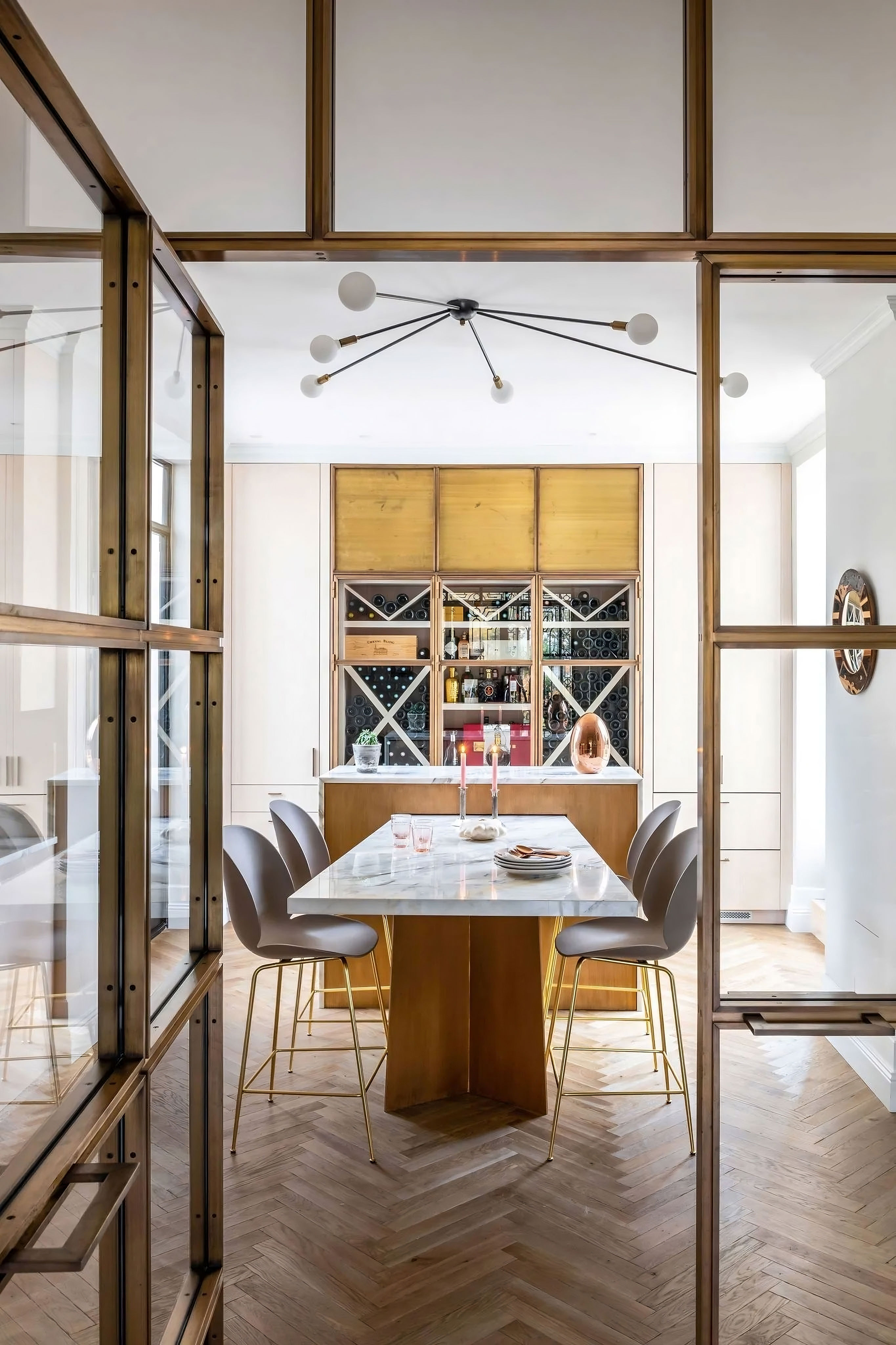 ProjetPour ce projet d'aménagement de mobilier sur mesure d'un hôtel particulier des années 30 de Bordeaux, la décoratrice Nicole Joinau a mené une restauration minutieuse avec l'aide d'artisans d'art pour redonner vie à cette magnifique propriété. Le propriétaire, qui avait déjà collaboré avec Nicole Joinau pour la restauration de précédentes maisons, souligne le soin apporté aux détails. Les éléments d'époque les plus intéressants ont été conservés, tels que la porte d'entrée, le vitrail de l'escalier, les cheminées et les boiseries du salon. Les pièces de designers et les matières nobles ont été utilisées pour créer une ambiance intime teintée de féerie. Le mobilier sur mesure, y compris la cuisine, le salon, les dressings et les salles de douche, a été réalisé par nos soins. La ferronnerie a été conçue par Julien Castilla-Madrigal, qui a accompli un travail remarquable sur les portes de la cuisine et de la cave à vin. Le résultat est une partition bien orchestrée qui met en avant la vision artistique de Nicole Joinau.